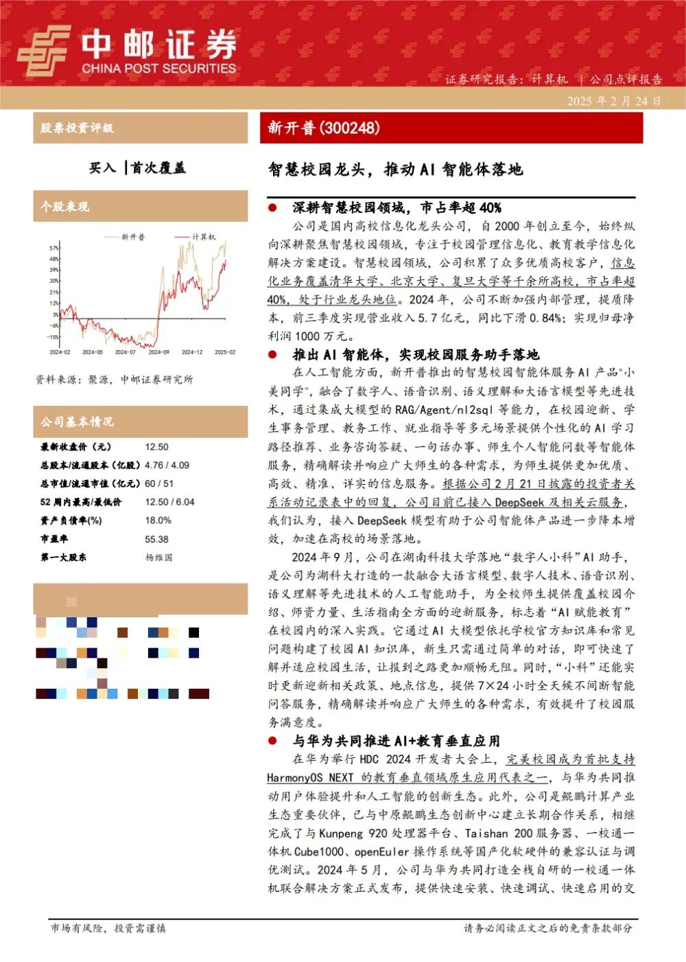 公司是国内高校信息化龙头,市场份额超40%,服务高校超1400所。2025年核心战略是AI化,其自研的高校垂类大模型“星普大模型”已完成网信办备案,并在30多所高校上线,应用于AI门户、智能问答等场景。