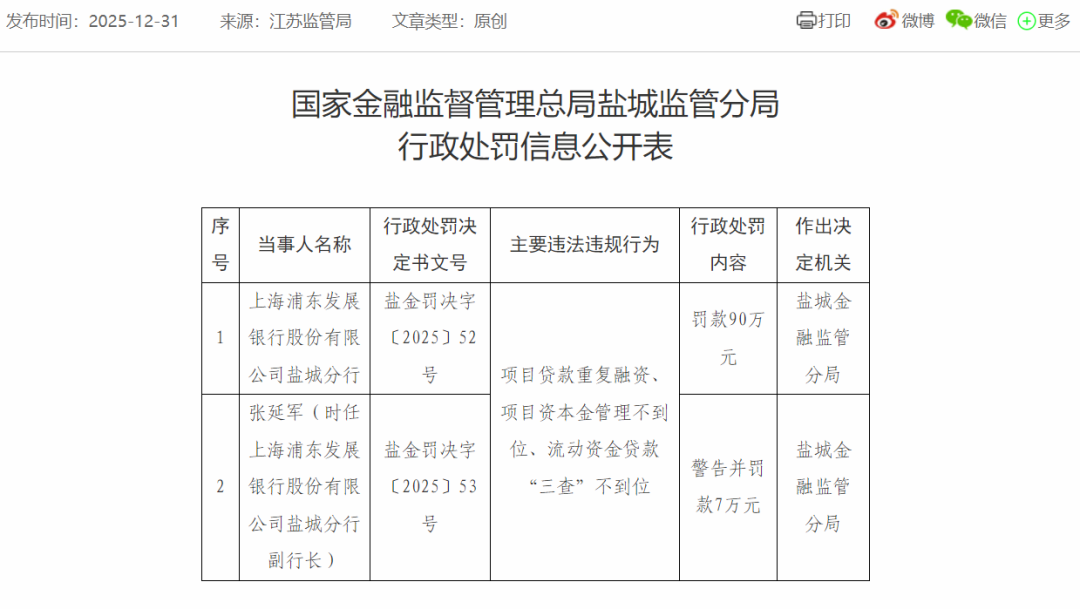 因项目贷款重复融资、项目资本金管理不到位、流动资金贷款“三查”不到位的主要违法违规行为,上海浦东发展银行股份有限公司盐城分行被盐城金融监管分局罚款90万元。
